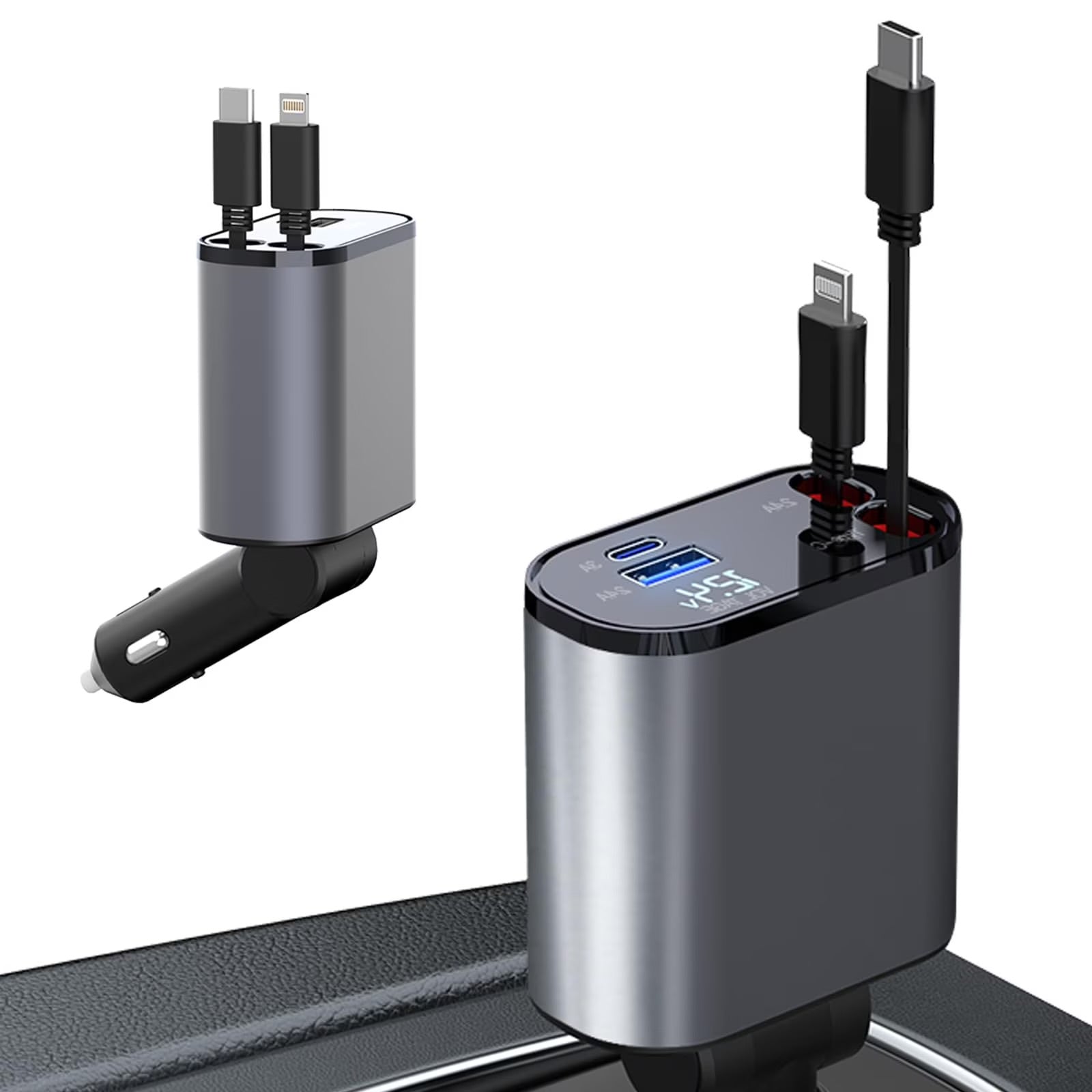 Este Cargador de Vehiculo 4 en 1 ha sido diseñado para ofrecerte máxima eficiencia y comodidad en tus viajes. Equipado con dos puertos de salida (USB y Type-C) y dos cables integrados (Type-C y Apple Lightning), es capaz de cargar hasta cuatro dispositivos al mismo tiempo, sin comprometer la velocidad ni la seguridad. Ya sea que tengas un smartphone, tablet, consola portátil o cualquier otro dispositivo USB, este cargador es tu mejor aliado en la carretera.